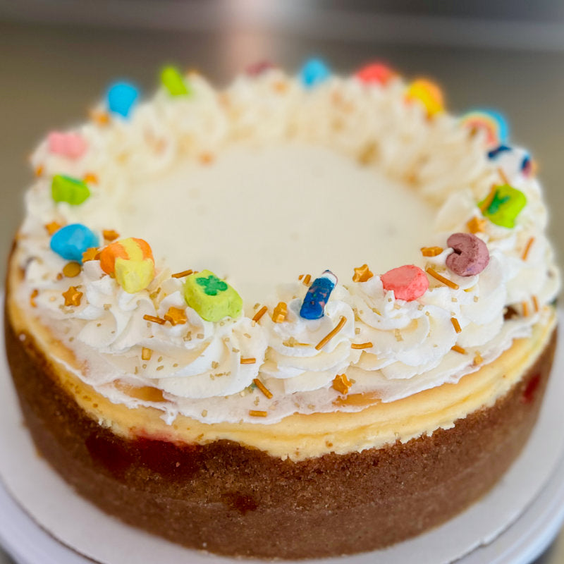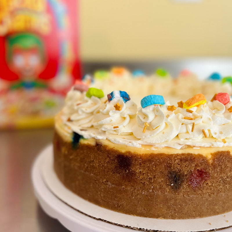 Our Lucky Charms Cheesecake is a sweet treat for cereal fans and cheesecake fans alike. This cake starts with a traditional graham cracker crust, our signature NY Style cheesecake with a creamy marshmallow taste and texture, loaded with Lucky Charms marshmallows and topped with fresh whipped cream.