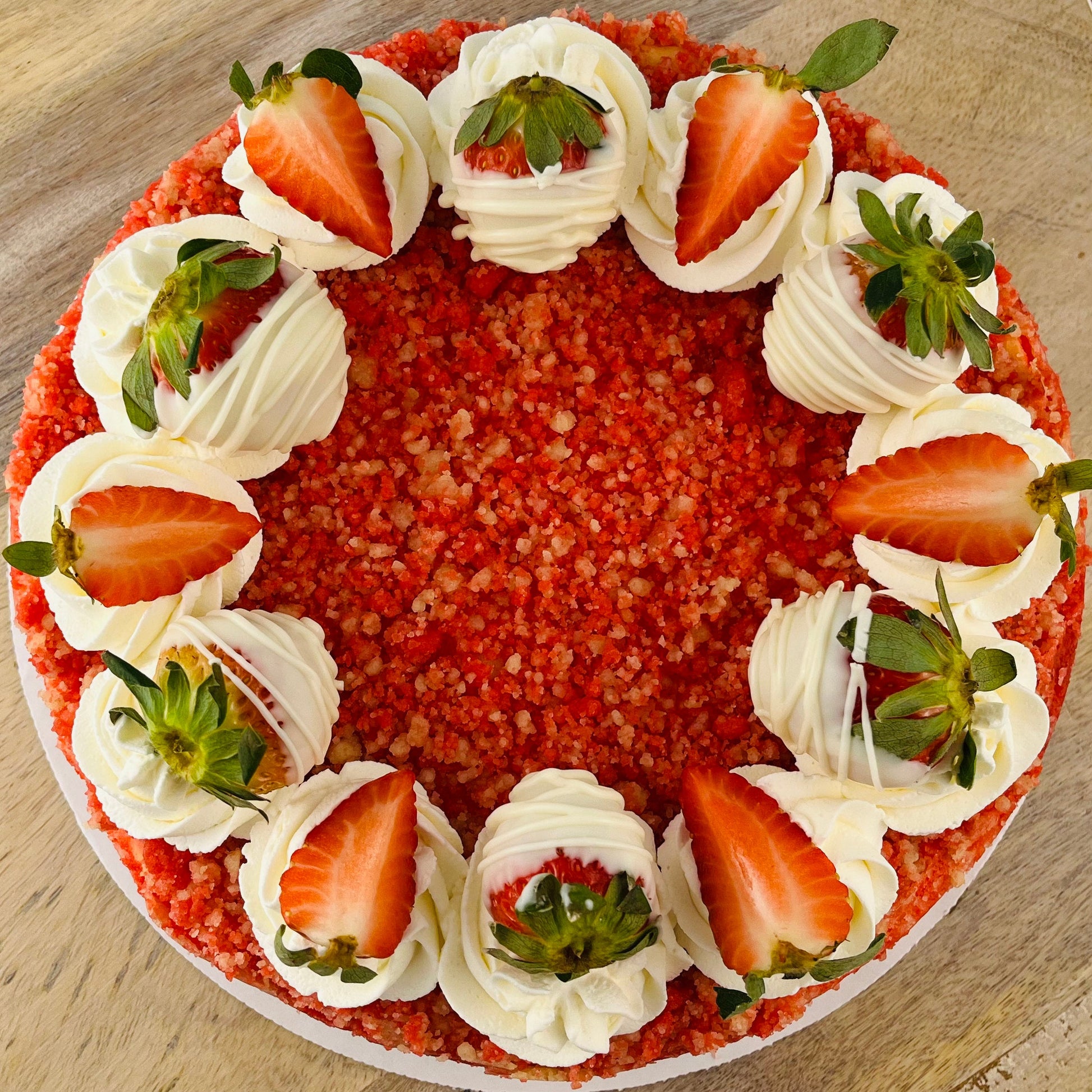 Our smooth and creamy cheesecake with hints of vanilla and strawberry, layered on top of a shortbread crust and topped with a vanilla and strawberry crumbly cake, reminiscent of our favorite childhood ice cream bar, strawberry shortcake. This is a Mini Cheesecake (7 inch round).